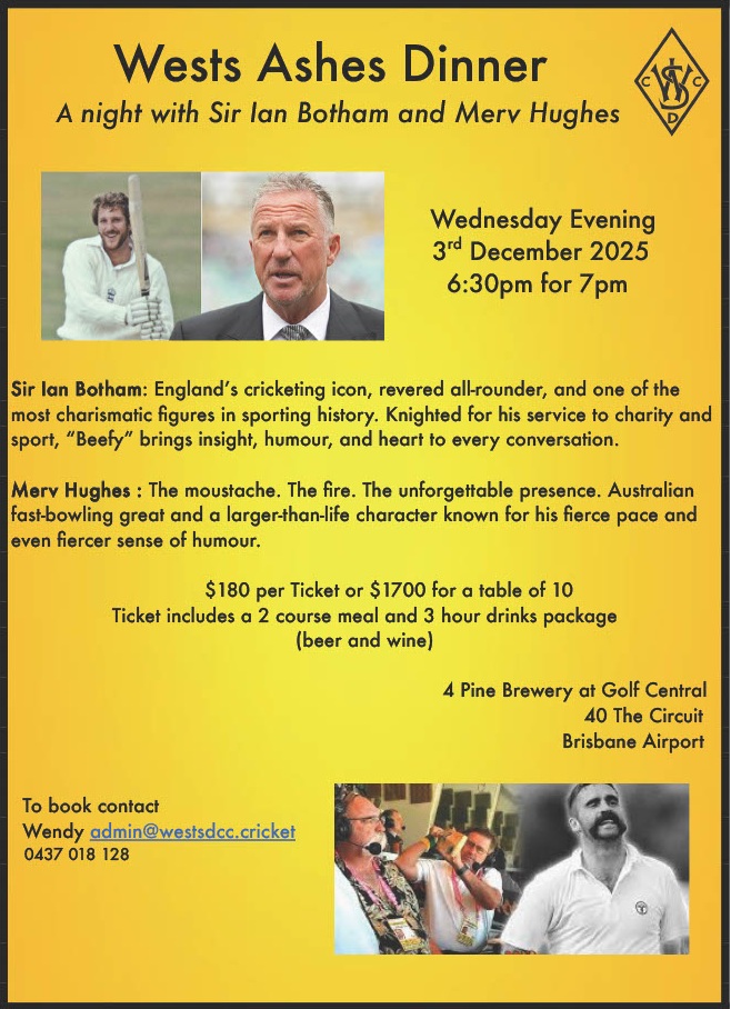 Western Suburbs District Cricket Club Brisbane Brisbane, Australia 4 Likes 5 Followers 1 hour ago Wests Ashes Dinner - A night with Sir Ian Botham and Merv Hughes Wednesday Evening 3rd December 2025 6:30pm for 7pm Partner Sponsors Your Answer If you wish to include a video or audio response, you can do this by including links to Youtube, Vimeo or SoundCloud (https://www.youtube.com/watch?v=xxxxxxxxxx OR https://vimeo.com/xxxxxxxxx) <% error.message %> <% message %>